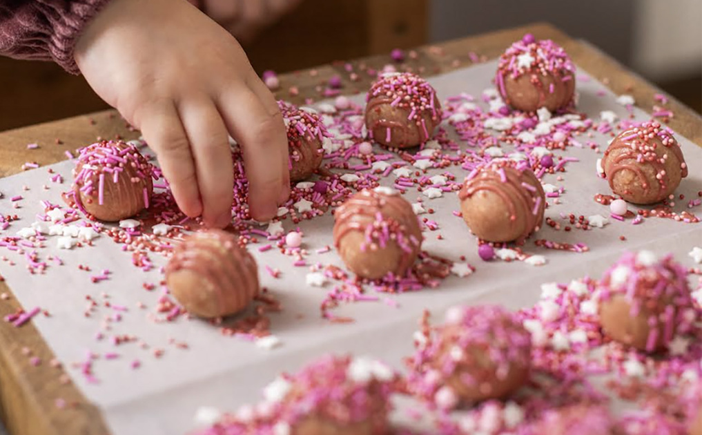 Máslo, cukr, piškoty a prach z lyofilizovaných jahod smícháme a přidáme smetanu. Potáhneme fólií a necháme lehce ztuhnout. Z těsta odebíráme kousky a tvoříme kulicky. Ozdobíme ruby čokoládou a cukrovým sypáním.