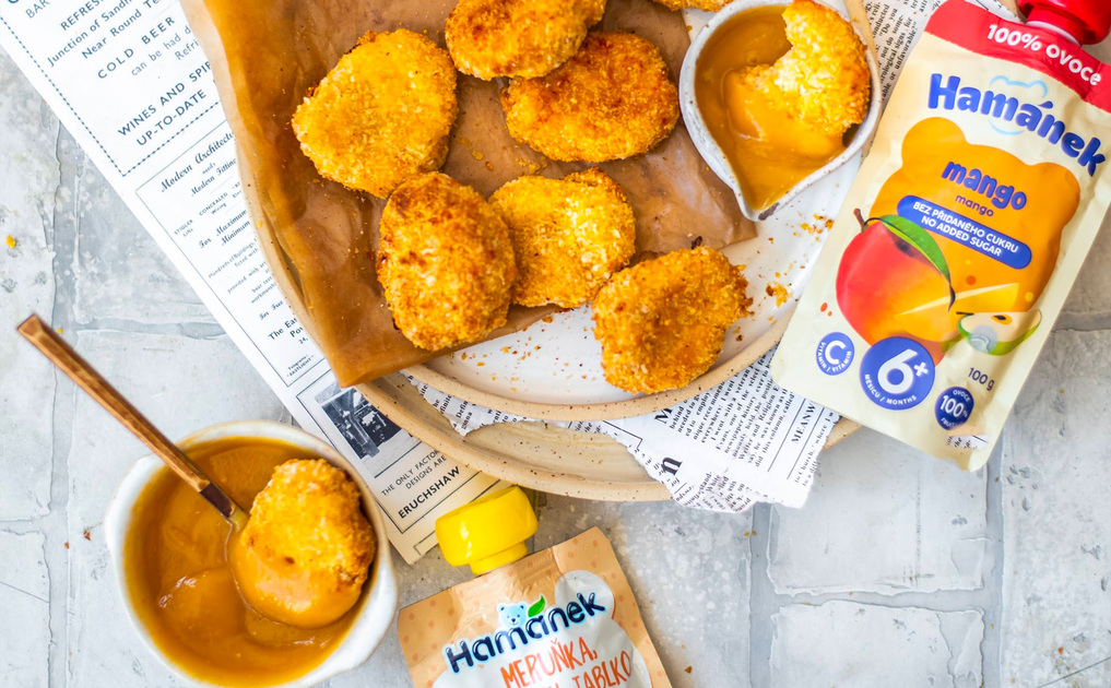 Křupavé kuřecí nugetky z trouby se SLADKOKYSELOU OMÁČKOU z kapsičky Hamánek. Možná to zní opět trošku zvláštně :D, ale vlastně to vůbec zvláštní není. Domácí sladkokyselá omáčka se obvykle dělá z meruňkového džemu, tak proč by to nešlo z meruňkové kapsičky? Kapsička je jen ovocné pyré a když se správně dochutí, vznikne k tomu omáčka, která mě k nugetkám fakt bavila. Nakonec jsem zvolila kombinaci meruňka/broskev a mango. Nugetky krásně křupaly a vzniklo tak jídlo, které bavilo děti i Majka.