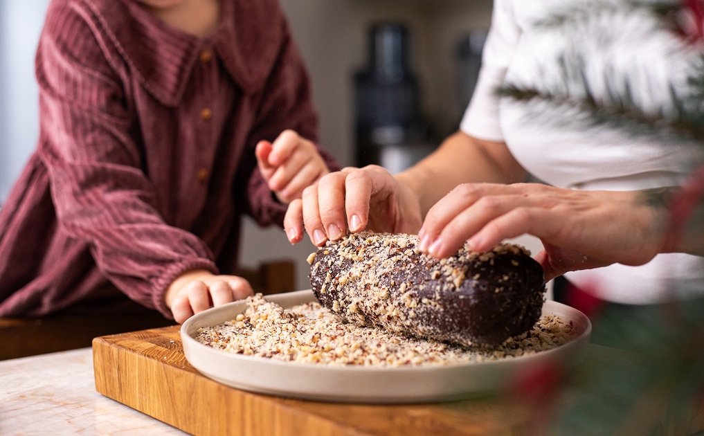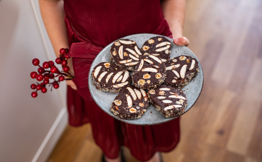 Čokoládu rozpustíme. Smetanu ohřejeme, přidáme lískoořechové máslo a postupně vmícháme k čokoládě. Přidáme javorový sirup, kakao a kávu a nakonec vmícháme piškoty a lískové ořechy. Pomocí potravinářské fólie vytvoříme váleček a necháme ztuhnout. Obalíme v lískových ořeších a nakrájíme na plátky.